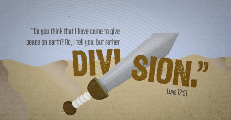 49 “I have come to bring fire on the earth, and how I wish it were already kindled! 50 But I have a baptism to undergo, and what constraint I am under until it is completed! 51 Do you think I came to bring peace on earth? No, I tell you, but division. 52 From now on there will be five in one family divided against each other, three against two and two against three. 53 They will be divided, father against son and son against father, mother against daughter and daughter against mother, mother-in-law against daughter-in-law and daughter-in-law against mother-in-law.”