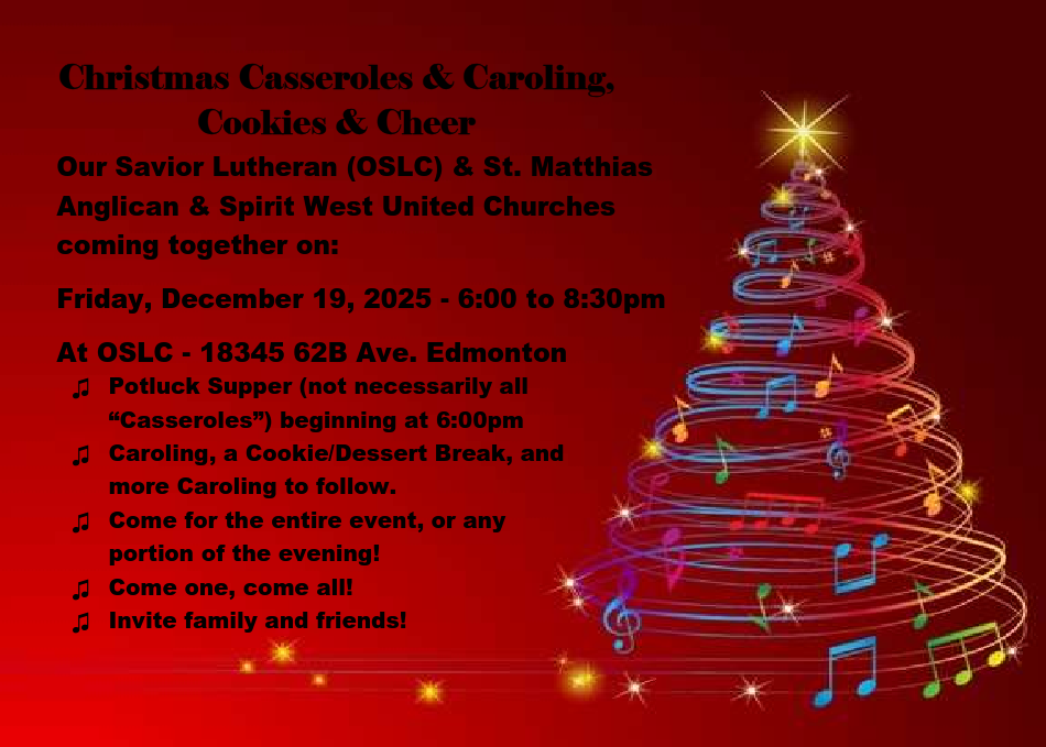 Join us for an evening of Casseroles & Caroling, Cookies & Cheer at Our Savior, starting at 6pm.